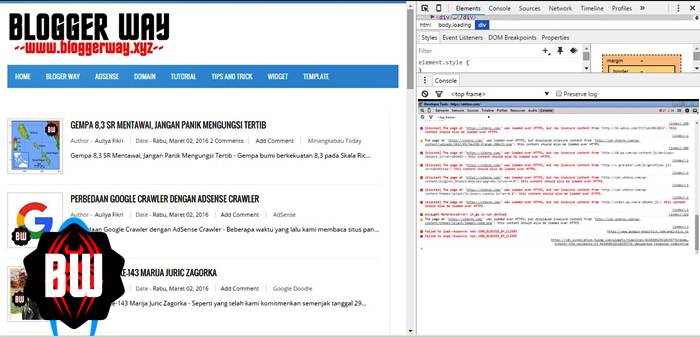 Adapun cara termudah untuk mengetahui tanda apabila blog anda mengalami error saat menggunakan SSL Gratis Cloudflare yaiitu tidak munculnya tanda gembok berwarna hijau disamping URL anda di Address Bar Browser Chrome anda, Bagi anda yang ingin mengetahui error apa yang terjadi pada blog anda, anda bisa mengklik kanan pada halaman bebas di blog anda, kemudian klik Inspect (jika anda menggunakan Browser Chrome) atau anda bisa tekan Ctrl+Shift+I pda keyboard sesuai dengan settingan default browser Chrome. Maka anda akan melihat tampilan seperti dibawah ini,