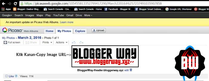 Setelah itu Klik Kanan Foto yang sudah anda Upload dan Klik Copy Image Address, kemudian buka Dasbor Blog anda dan Klik Widget Header Blog, Hapus Header yang ada, kemudian Pastekan URL Header blog dari Foto Picasa anda ke kolom dari Web seperti yang terlihat pada gambar dibawah Ini, Kemudian Klik Simpan.
