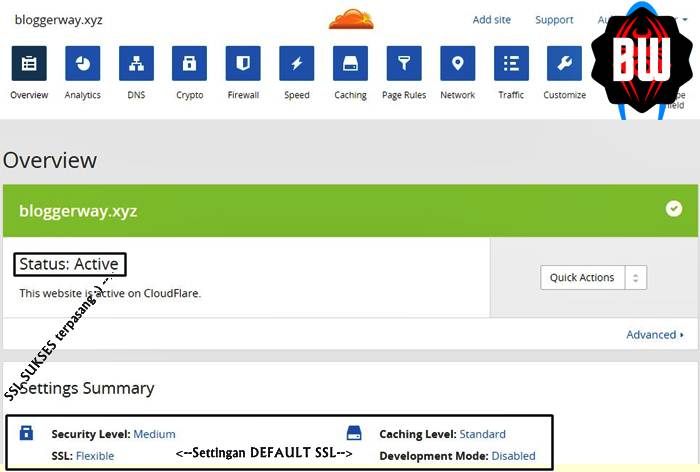 Jika proses integrasi telah selesai, maka pada akun Cloudflare anda akn tertulis Active, sekarang Domain blog anda telah memakai SSL dari Cloudflare,