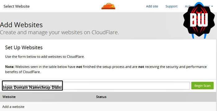 Setelah Log In, masukanlah domain Namecheap anda pada kolom Add Webste, lalu klik Scan, proses Scanning biasanya memakan waktu sekitar satu menit saja,
