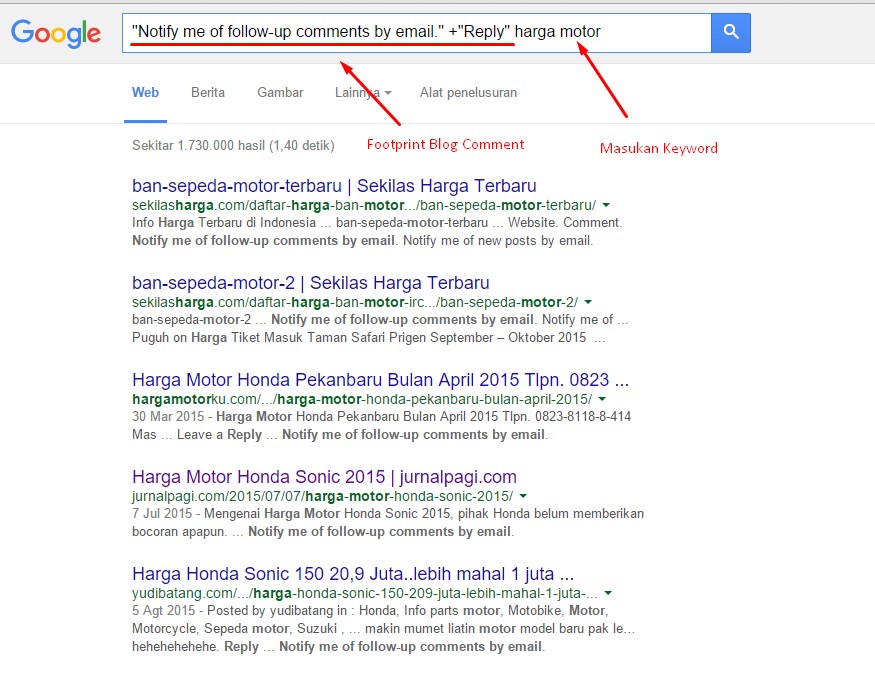 Biasanya saya mencari dengan kueri atau kata kunci di Google, teknik ini dinamakan dengan footprint, ya backlink footprint memang sangat mantab untuk mencari backlink jenis blog comment, berikut ini contoh cara saya mencari blog comment: